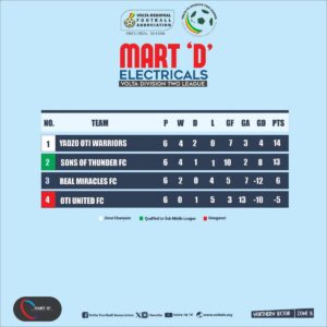 Yadzo Oti Warriors topped their group with 14 points after six matches, while Sons of Thunder FC followed closely with 13 points.