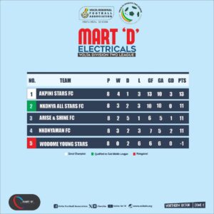 Eight teams have secured qualification for the Sub-Middle League of the ongoing Volta FA Division Two League following the conclusion of the preliminary stage in the Northern Sector.