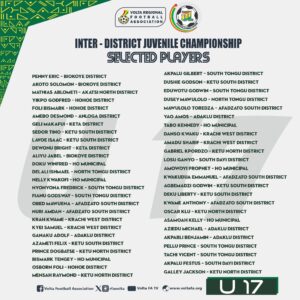 The Volta Regional Football Association has invited U-15 and U-17 players who will represent the region in the upcoming Inter-Regional Juvenile Championship.